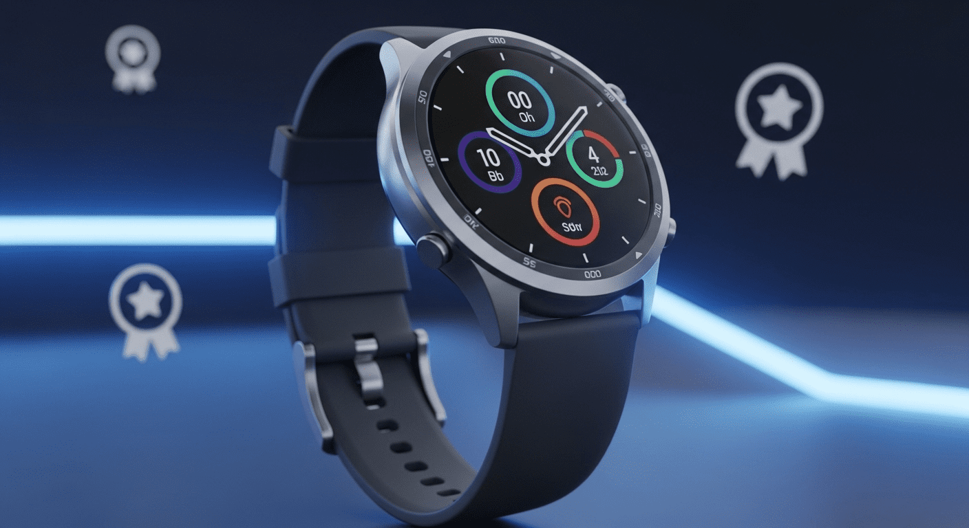 A modern smartwatch, the Amazfit GTR 3, showcasing its sleek design and advanced blood oxygen sensor, placed prominently in a bright and sophisticated tech setting with approval symbols in the background. No texts on scene. Keywords: photorealistic style, high resolution, 4k details, HDR, cinematic lighting, professional photography, studio lighting, vibrant colors.
