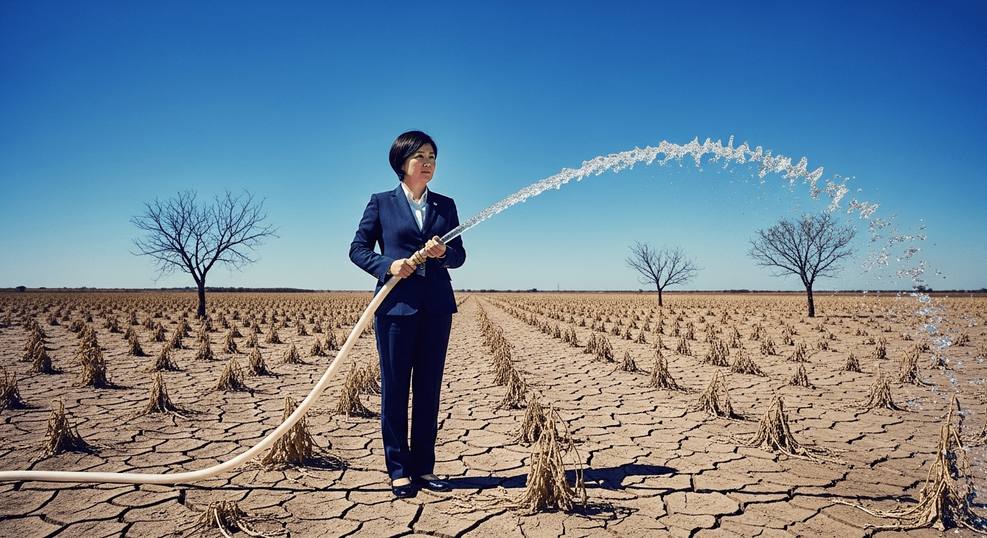 A government official standing in a dry, cracked field with wilted crops, holding a water hose and surrounded by small trees under a clear blue sky. Photorealistic, 4K, HDR, cinematic lighting, ultra detailed, award-winning photography, studio shot, vibrant colors.