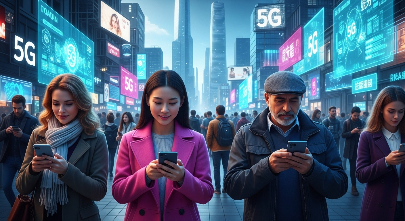 A bustling urban landscape showcasing advanced 5G technology with high-speed connectivity clearly represented through vibrant digital interfaces, skyscrapers, and a diverse crowd of people engaged with their devices. no texts on scene. Keywords: photorealistic style, high resolution, 4k details, HDR, cinematic lighting, professional photography, studio lighting, vibrant colors.